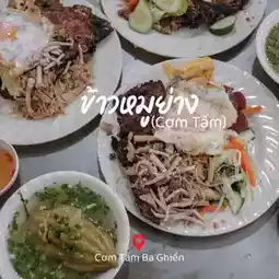 Broken rice (small grains of rice from milling) served with grilled pork on the bone, fried egg, Vietnamese sausage, and shredded pork skin, topped with sweet and sour sauce, served with cucumber and pickled vegetables.