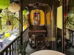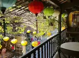 Hoi An Roastery Espresso & Coffee House was a cafe I happened to visit to escape the heat, but it was nice to have a quiet time drinking coffee in a cafe with the atmosphere I wanted to cool off. There was also a separate seating area for tea ceremonies, and the place where the curtains were fluttering in the wind was so pretty. I only recorded it in a video, so it would be burdensome to upload it, so I'll explain it instead, but if you don't really want the air conditioning on a day that's not too hot, I recommend spending time leisurely at a sitting table. This is the terrace seat that I desperately wanted to sit on. It's close enough that you can jump over it if you're good at long-distance jumping (actually, you can't), and it's connected to the building next door with colorful lanterns. The atmosphere created by the stamens on the back swaying in the wind and the leaves reflecting the sunlight was so pretty.