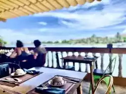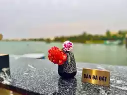 and the outdoor terrace seats offer a view of the Thu Bon River.