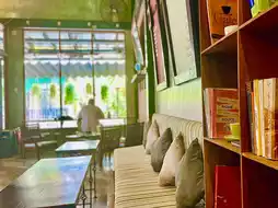 The interior has a wide ceiling and a good sense of openness, and the outdoor seating has cute low chairs typical of Vietnam.