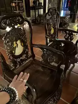 Stepping inside feels like entering a different era. The space is adorned with colorful lanterns, blooming plants, and intricately carved wooden furniture that speaks volumes about the craftsmanship of centuries gone by.