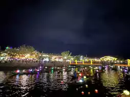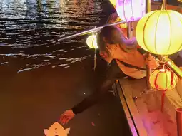 • Lanterns drifting gently on the Thu Bon River at twilight — carrying small wishes, soft and hopeful