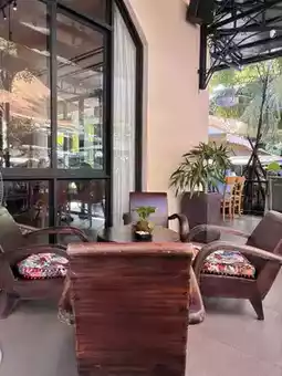 The spacious and upscale interior offers a variety of food, wine, and beverage options. The terrace and garden offer ample seating, making it a perfect place to relax.