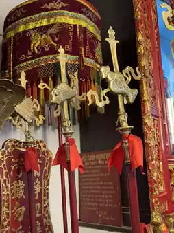 The hall is a majestic building, with vermilion gates, intricately carved eaves, and colorful porcelain dragon and phoenix decorations on the roof, showcasing the exquisite craftsmanship of Chinese artisans. Passing through the mountain gate, the courtyard is filled with the scent of incense, creating a solemn atmosphere. The main deity enshrined in the main hall is Guan Yu (Guan Gong), a symbol of loyalty, protection, and blessing, and a shared spiritual sustenance for the Chinese community.