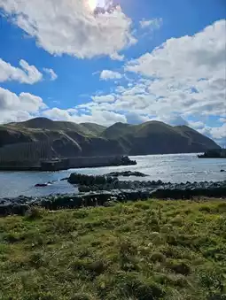 In front of the vast ocean, you can see Kaibajima Island, and on the opposite shore, Cape Kanedano.