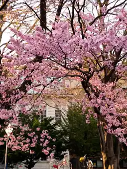 🌿 There's a beautiful cherry blossom path lined with tall sakura trees. When the wind blows, the petals fall like snow — it’s absolutely dreamy.