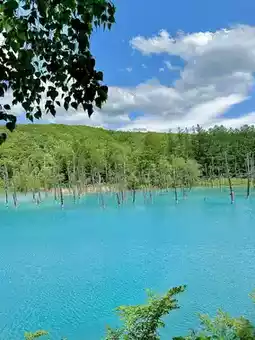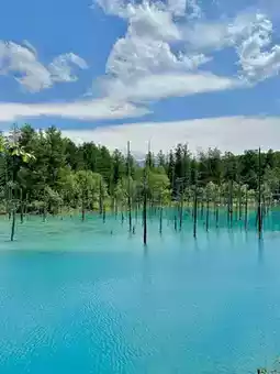 One of the must-visit spots during a trip to Hokkaido, Japan, is the Blue Pond in Biei! The stunning blue color of the water makes it an incredibly beautiful place, perfect for a leisurely stroll and capturing gorgeous photos.