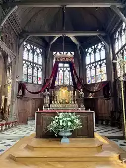 This old church, built not with stone but with wood, exudes a warm feeling from its exterior. Upon entering, the ceiling, resembling an inverted ship, immediately catches your eye.