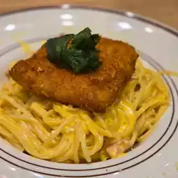 Carbonara with fish fillet, a huge portion. The pasta is quite creamy, normal play, the fish fillet is no taste of ready-made frozen goods.