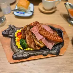 I'm going to have the long-awaited Hong Kong-style iron plate. The steaks include pork chop, chicken chop, two slices of ham, and half a strip of sausage. The pork chop is quite large, and although there is only half a strip of Si Hua Li sausage, it is bounded by flowers, so the production is serious. There is no steak anymore in the steak meals nowadays.