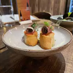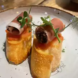 The bread is crispy on the outside and soft on the inside, topped with tomato puree and garlic. The ham wraps around crispy bacon and mushroom pieces.