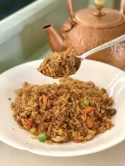 The fried rice is distinct and dry, and it is even more flavorful with the addition of black truffles and beef.