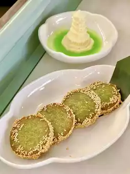 The dessert is a surprise, with a crispy crust and a green tea aroma, and a lot of tasty sesame seeds on the side. With taro paste in the filling, the taste and texture are rich.