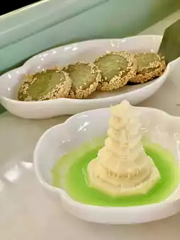 This must-order dessert is designed in the shape of Leifeng Pagoda, one of the Ten Scenic Spots of West Lake in Hangzhou. It tastes slightly sweet and gives a refreshing feeling.