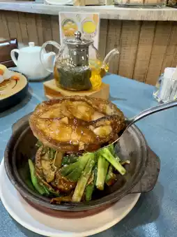 The clay pot rice with abalone and chicken features abalone pieces and tender chicken chunks as the main ingredients, complemented by the crispy rice at the bottom of the clay pot, creating a rich and layered taste.