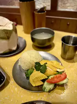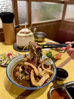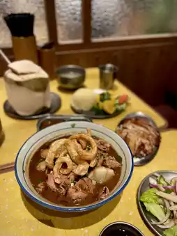 [Boat River Big] Large bowl of rich flavor, beef 🐮 ingredients are many ~ There are also large portions of fried pork skin & sweet stewed carrots, super rich. Another [Hainanese chicken🐥 with oil rice], the original chicken is oily and tender, dipping sauce is more delicious. For snacks, [Grilled Squid] 🦑 Whole whole is big and bouncy; [Grilled Pork Neck] 🐽 has grilled fragrant meat and crispy meat, every Thai food must order! The [White Cloud Claw] consistently sweet and sour appetizer ~