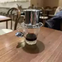 The glass cup is equipped with a Vietnamese drip pot, and the coffee falls into the cup drop by drop; the coffee is rich and mellow, with a little condensed milk, which neutralizes the sweet and bitter taste of coffee, and is smooth and very characteristic!