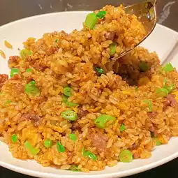 The fried rice is well-separated, the beef is cut into small pieces, and the aroma of the rice is enticing.