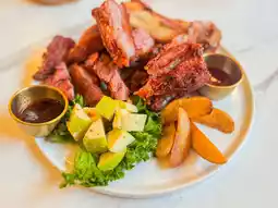 The beef tenderloin is fried until 70% done, very tender and juicy, making the taste richer. The side dishes include crispy potato wedges and salad.