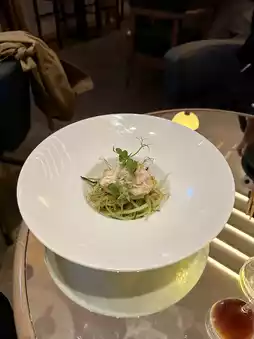 Hokkaido Spicy Squid Liver Sauce and Snow Crab Meat Pasta, with more crab meat than pasta, and crispy cucumber adding layers to the main dish.