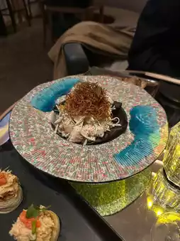 Fig Crispy Potato Crab Roe Salad, made with figs, fried potato shreds, crab roe in abalone sauce, and cucumber shreds.