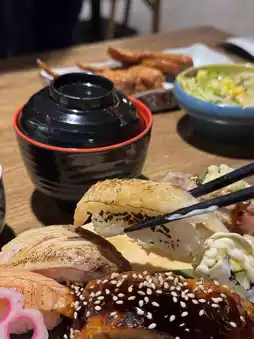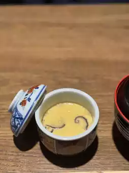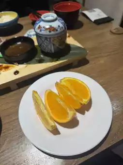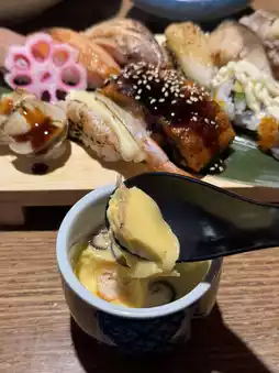 Very affordable sushi and sashimi set meal with tea bowl steamed bean curd soup
