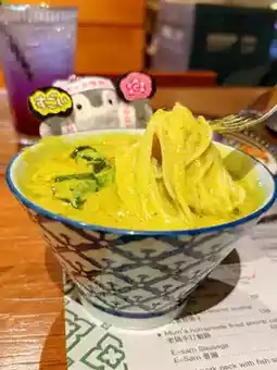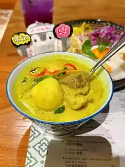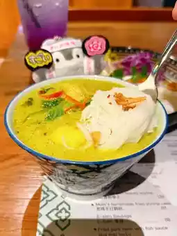The signature Thai ramen that is the main dish of the must-try restaurant ❤️ The shape is beautiful and pleasing to the eye 🥰 Served with green curry chicken, the sauce is spicy and rich, and goes well with the bouncy and delicious ramen 👍 Every bite is full of rich coconut flavor 🤤 The chicken is soft and tender, the side dishes are refreshing and chewy, the overall combination is excellent 😚