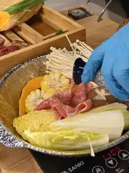 After we took photos of the platter, the waiter cooked 2 slices of beef shoulder and let us dip them in raw eggs🥚 to eat. The meat is so tender. After that, the waiter carefully placed various vegetables 🥬 and 2 other slices of beef shoulder in the pot. Once the food is cooked, we can enjoy it slowly or add our favorite ingredients. The quality of the beef shoulder was really high, and it felt like we could easily make our money back by eating a few more slices, so we ordered a few more. The next serving of meat was also large and marbling-filled.