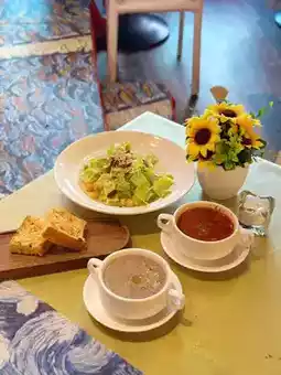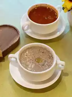 The soup comes with basic coffee or tea, sugar and milk are served separately.