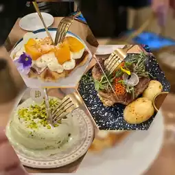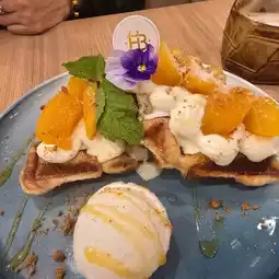 Mango Sea Salt Cheese Milk Cake Marshmallow Horn Waffle with Coconut Ice Cream $108