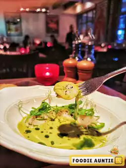 🥗 First is the "Hokkaido Scallops in Oil and Vinegar Sauce", with cucumber and coriander sauce, green chili, and crushed black olives, showing a fresh seafood flavor and unique taste. This dish combines different seasonings for a delightful delicious enjoyment. A really appetizing appetizer.