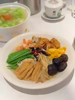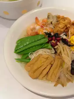 The thin noodle line is smooth and refreshing. There are many ingredients, including fresh shrimp, winter mushrooms, bean sprouts, egg strips and other ingredients. The taste is rich.