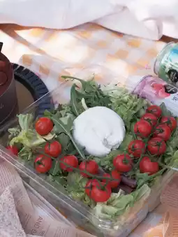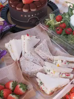 Food: Sandwiches, cakes, salads, snacks, fruits, and drinks