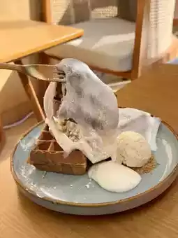 Seeing that everyone was ordering it, we also ordered a hojicha marshmallow waffle. The table shape is not pleasing, but it is amazing to eat!
