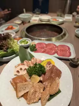 There is a large piece of pork plum meat that is grilled and cut open to share happily