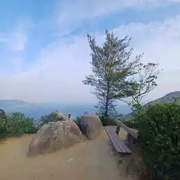 As we continued along the crest, each viewpoint offered a fresh perspective of Hong Kong’s unparalleled natural beauty. The cool mountain breeze was invigorating, and despite the weekend crowd, the atmosphere remained peaceful. At the final viewing area, a rustic wooden bench awaited—ideal for catching our breath and capturing the moment.