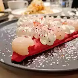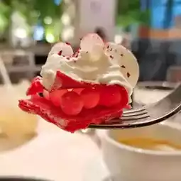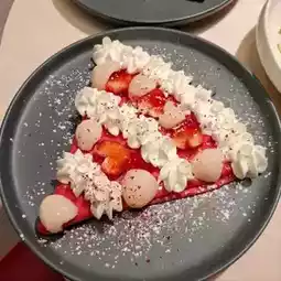 Finally, for dessert, this [Litchi Strawberry Crepe] is a bright red crepe with lychee-flavored popcorn sandwiched in the middle. It tastes very good! The top layer is filled with litchis and strawberries, sweet but not greasy, and the crust is thin, perfect for dessert