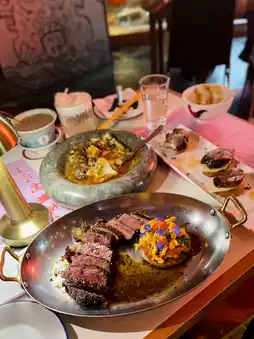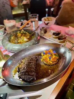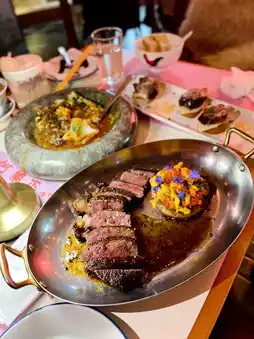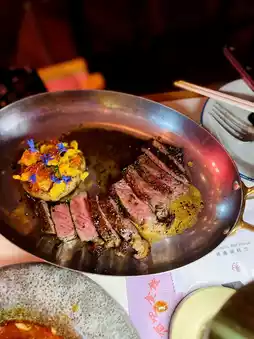 🔸Seared grass-fed m6 wagyu sirloin with black pepper, served with fried salmon rice cake, Hokkaido tomato cream cheese sauce and salmon roe $358