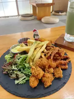 There are French fries, black pepper sausage, chicken cartilage, squid beard, and fried oysters