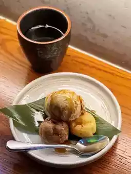 The sweet caramel ice cream is smooth and delicate, drizzled with brown sugar syrup. The three different flavored Japanese cream puffs are crispy on the outside and soft on the inside, filled with dense fresh cream.