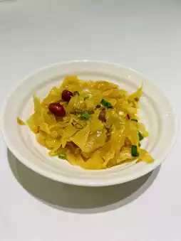 This Fujian Red Mushroom Seafood Braised Noodles is colorful, with the freshness of seafood blended with the aroma of red mushrooms. The texture is smooth, and the accompanying vegetables also add a fresh taste to the whole dish.