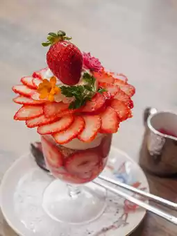 Topped with sweet strawberries, paired with fresh cream & strawberry jam,