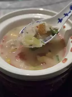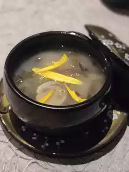 There is always no shortage of soups in the sets designed by Master Jiang, and this time is no exception. Golden soup chrysanthemum prickly ginseng, the soup is rich and fragrant, prickly ginseng taste is always pleasing, sprinkled with a few chrysanthemum petals, emit a unique aroma, a metaphor for the chrysanthemum poem "Remnant Chrysanthemum" written by Jia Tanchun.