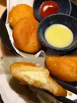 The round and golden French cheesecake has a crispy outer layer and is filled with mashed potatoes and semi-melted cheese sauce. A must-try for cheese lovers!