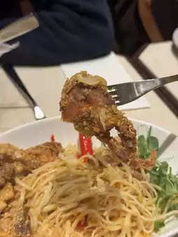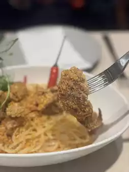 Soft-shell crab, garlic and chili linguine: A fusion of Eastern and Western cuisine, the soft-shell crab is fried to a crispy outer shell and juicy and tender inside with a strong seafood flavor. After the garlic is sautéed in olive oil, it releases a rich aroma. The flat spaghetti has a chewy texture and can absorb the sauce very well, making every bite full of the flavors of garlic, chili and seafood. You can’t stop eating it!