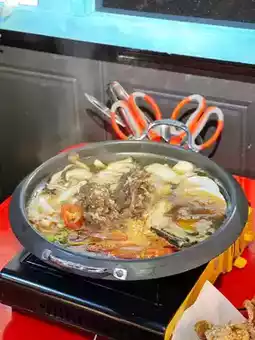The meal comes with instant noodles, which can be upgraded to translucent glass noodles that absorb the essence of the broth.
