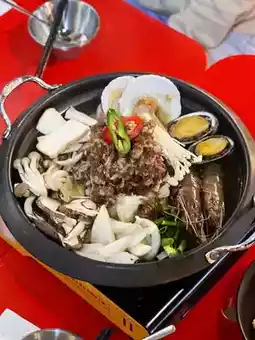 Slices of beef piled high with rich and evenly distributed marbling, the beef is flavorful, tender, and juicy; the shrimp is smooth and bouncy, full of freshness; the thick abalone meat is cleaned of its innards, offering a distinct abalone flavor; the thick, white scallops are purely sweet, with a crunchy skirt and tender crescent part, along with squid tentacles, assorted mushrooms, and vegetables, the broth becomes more flavorful as it cooks.