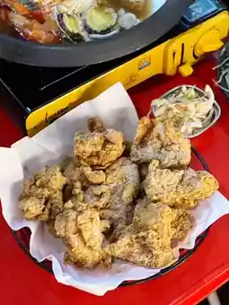 The Korean fried chicken consists of multiple boneless pieces, with golden, crispy skin and a thin, non-greasy coating. The white chicken meat retains plenty of juices, making it tender and not dry, sprinkled with cheese powder.