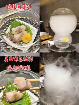 1️⃣ Thinly sliced butterfly fish: Wrap the sweet shrimp meat, add bamboo charcoal leaves and perilla flowers, and the chef soaks the whole thing in liquid nitrogen, the visual effect is perfect!