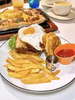 Want to eat savory waffles can choose this, two large pieces of smoked pork loin 😆 There is a sun egg on top, and there is also a syrup for you to fall down, waffle is talking about up and down, feels like an extremely thick version of a burger
